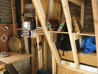 The landlords of this property had put a climbing wall back in this shack, and said to me that i could dismantle it. I kept some of the pulling points for exercise, but this wonderful meta-structure provided for interesting shelving options:
