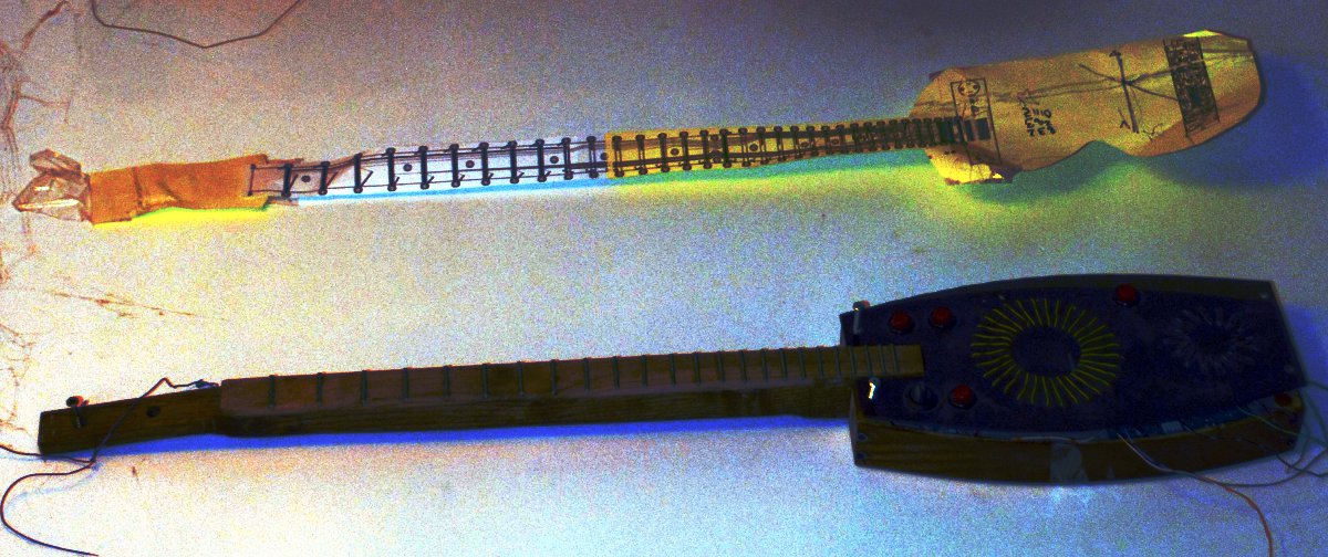 The tar-body is interesting because it has two chambers. The larger one supports and resonates the bridge, but the smaller one also senses pressure gestures. Knobs are customary for the classic electric guitarist– add those too.